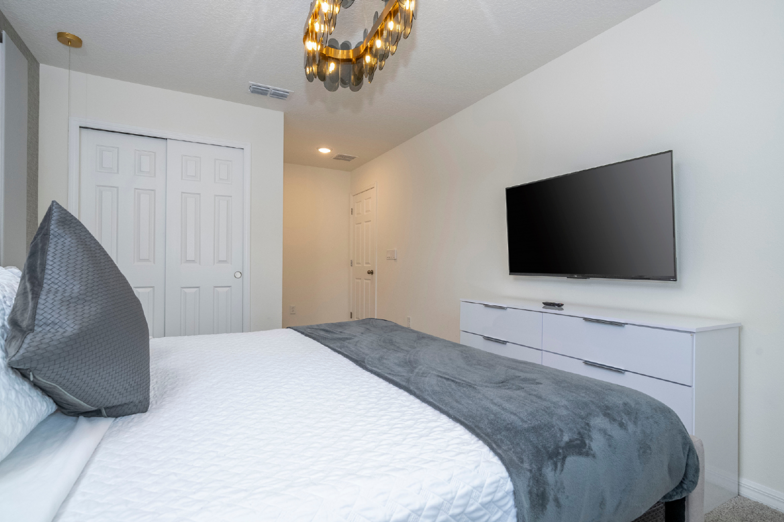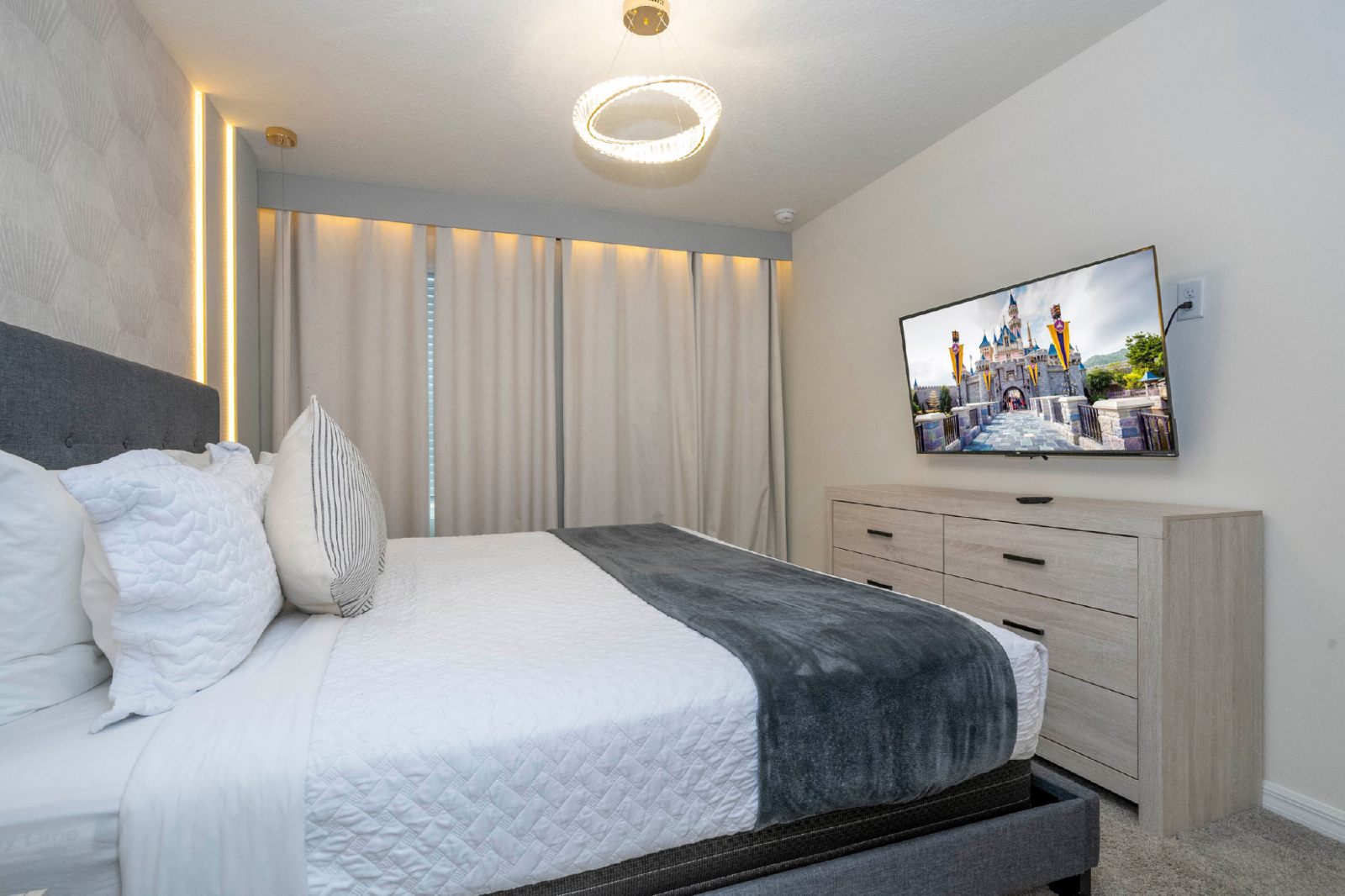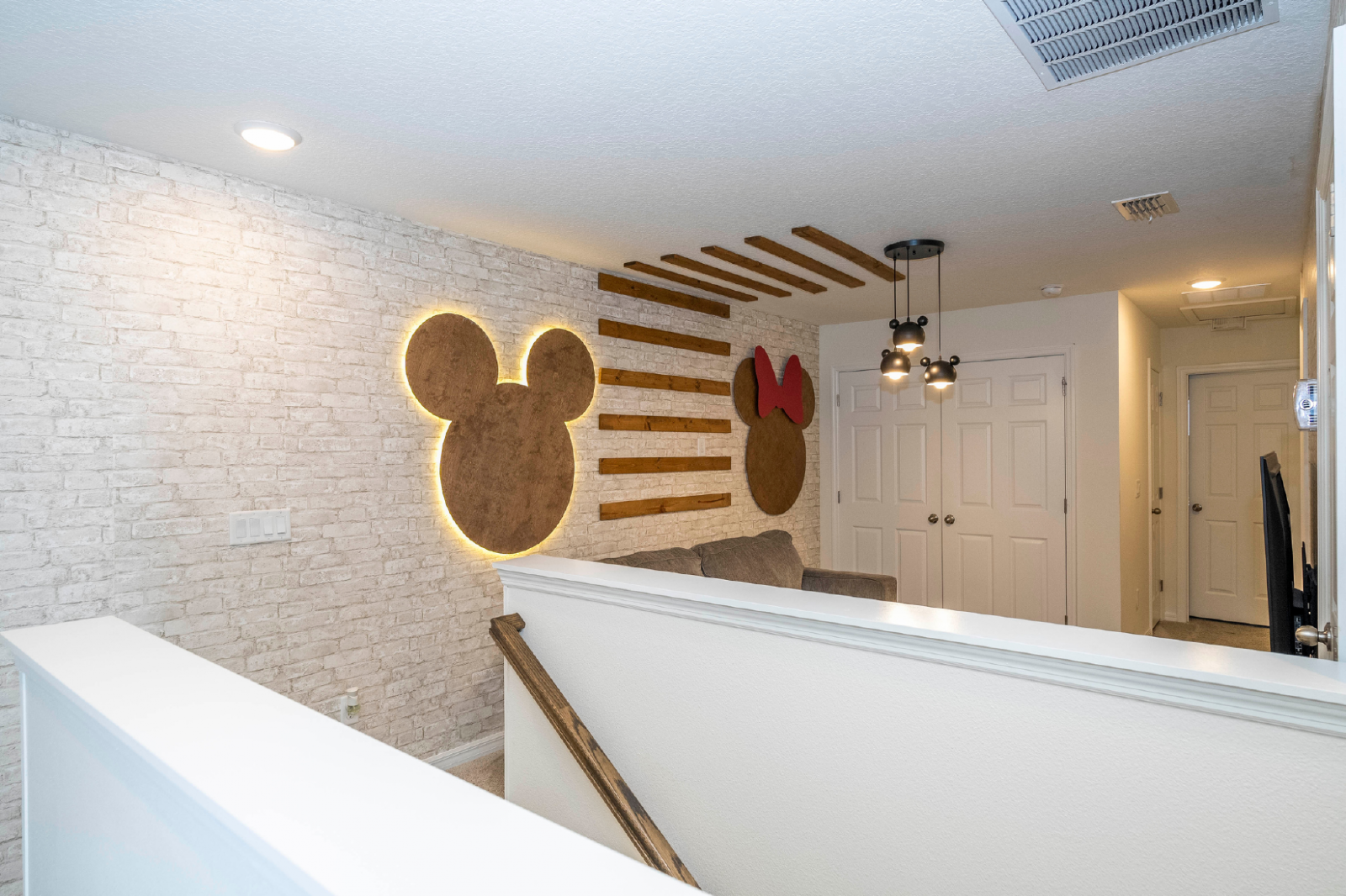 This beautiful luxury town home professionally decorated with Disney themes upstairs bedrooms and it has spacious rooms with full bathrooms! The most beautiful amazing amenities community huge resort style heated pool water rider, pool side cabana, large fitness center, surf simulator, basketball, and football grounds, restaurants, bar, playground close to Disney World, dining restaurants and other attractions.